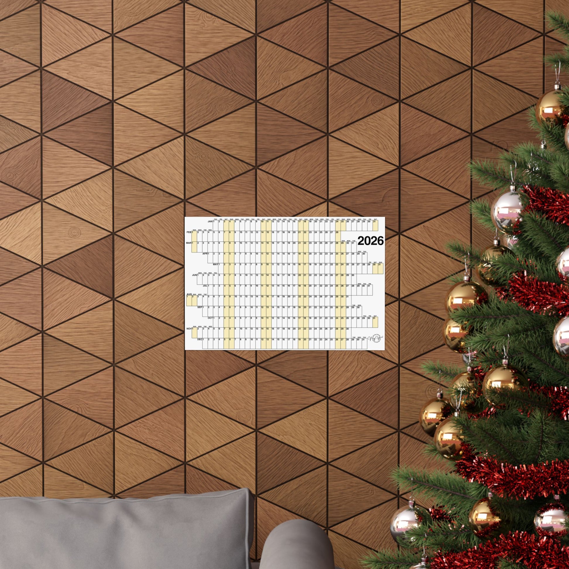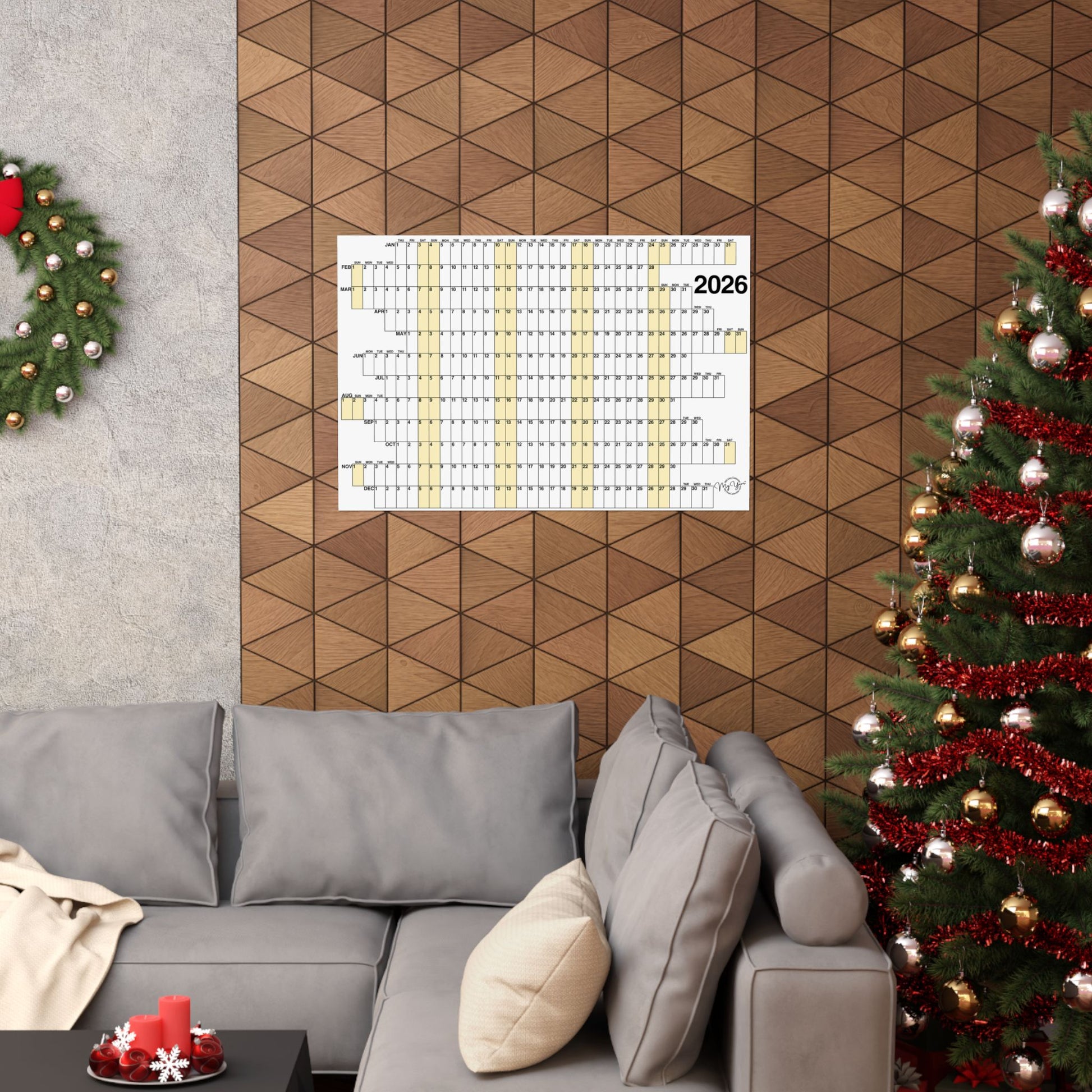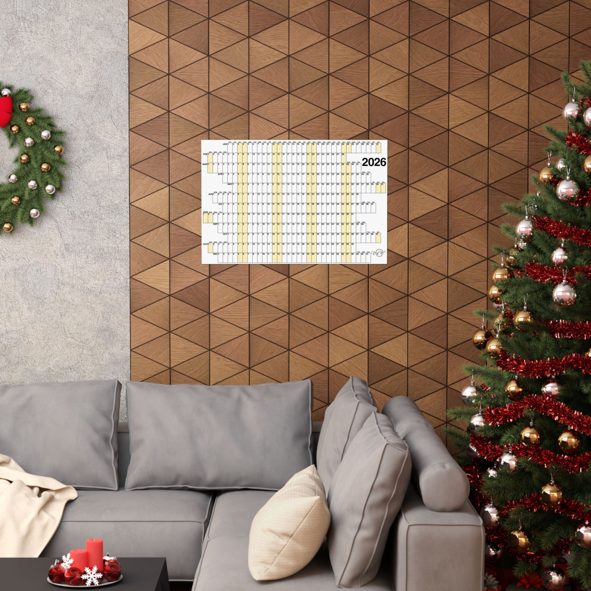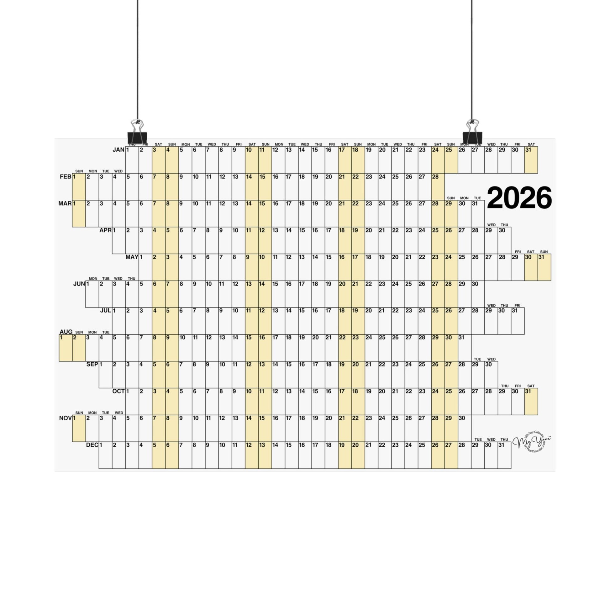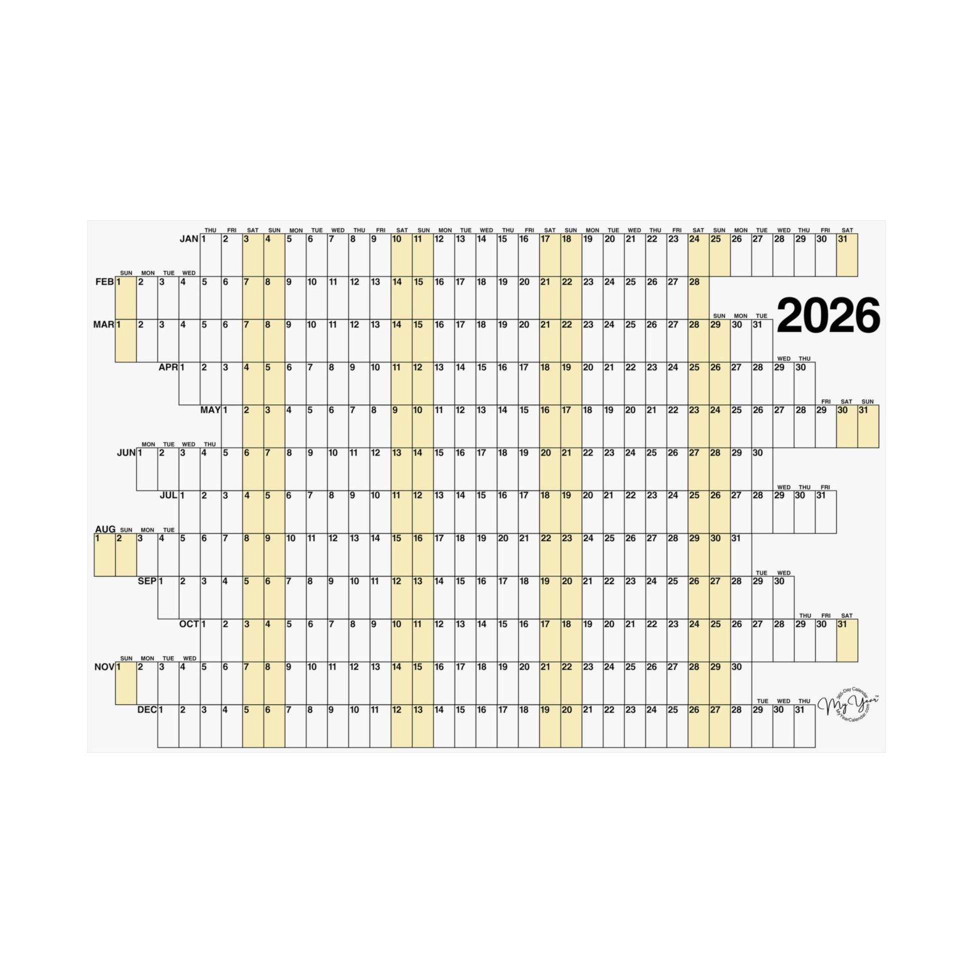 This 365-day calendar combines function and design. A unique concept with offset months and aligned weekends highlighted yellow, helps you to organize and visualize an entire year at a glance — precise and purposeful. Whether you're planning ahead, or looking back, this calendar settles easily into an office, studio, or living space, adding a thoughtful, contemplative touch. Printed on museum-grade archival paper with vivid giclée inks, colorfast under regular indoor light and resistant to yellowing.